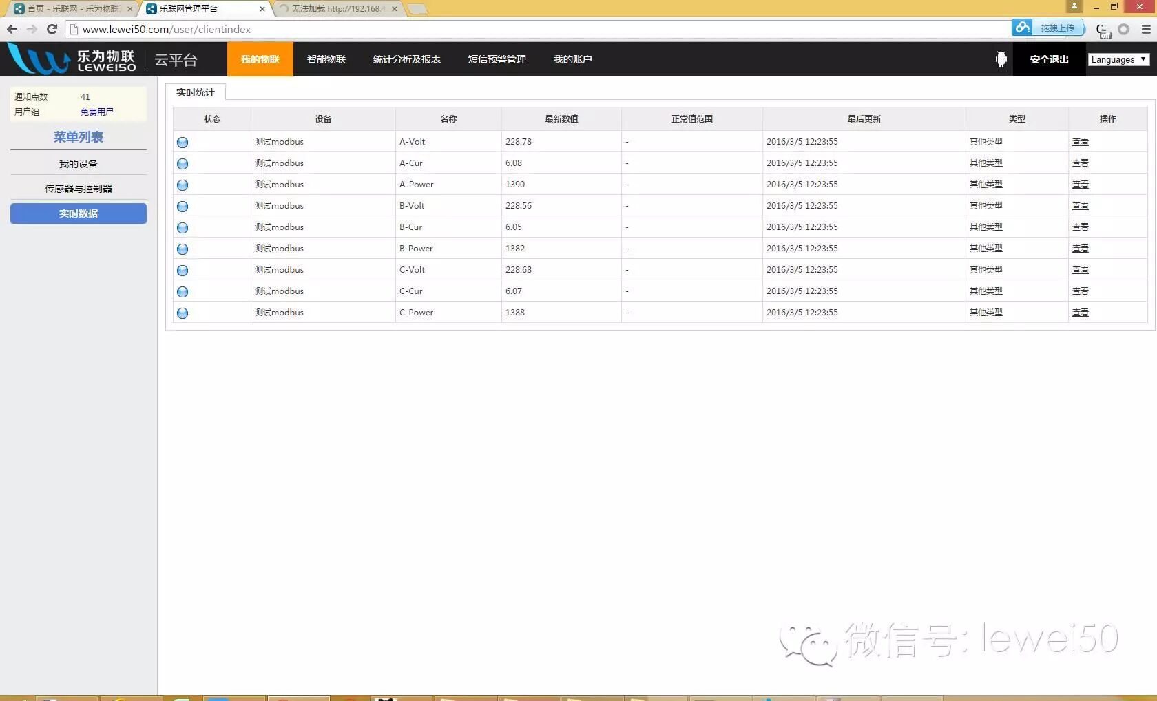 modbus 输出的三相电表,直接通过一个wifi 模块的web 配置,数据就进入乐联网平台进行监控了。全程不需要任何编程工作,就是配置一下,配置一下,配置一下(重要的事情说三遍)而已。